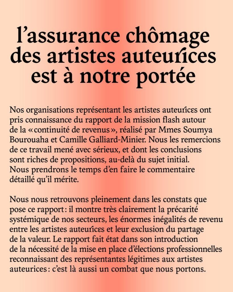 Nos organisations représentant les artistes auteurices ont pris connaissance du rapport de la mission flash autour de la « continuité de revenus », réalisé par Mmes Soumya Bourouaha et Camille Galliard-Minier. Nous les remercions de ce travail mené avec sérieux, et dont les conclusions sont riches de propositions, au-delà du sujet initial. Nous prendrons le temps d’en faire le commentaire détaillé qu’il mérite.