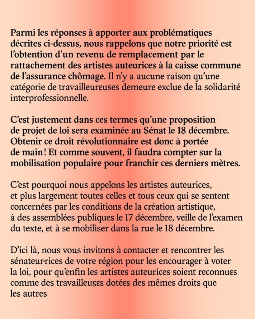 C’est pourquoi nous appelons les artistes auteurices, et plus largement toutes celles et tous ceux qui se sentent concerné·es par les conditions de la création artistique, à des assemblées publiques le 17 décembre, veille de l’examen du texte, et à se mobiliser dans la rue le 18 décembre.