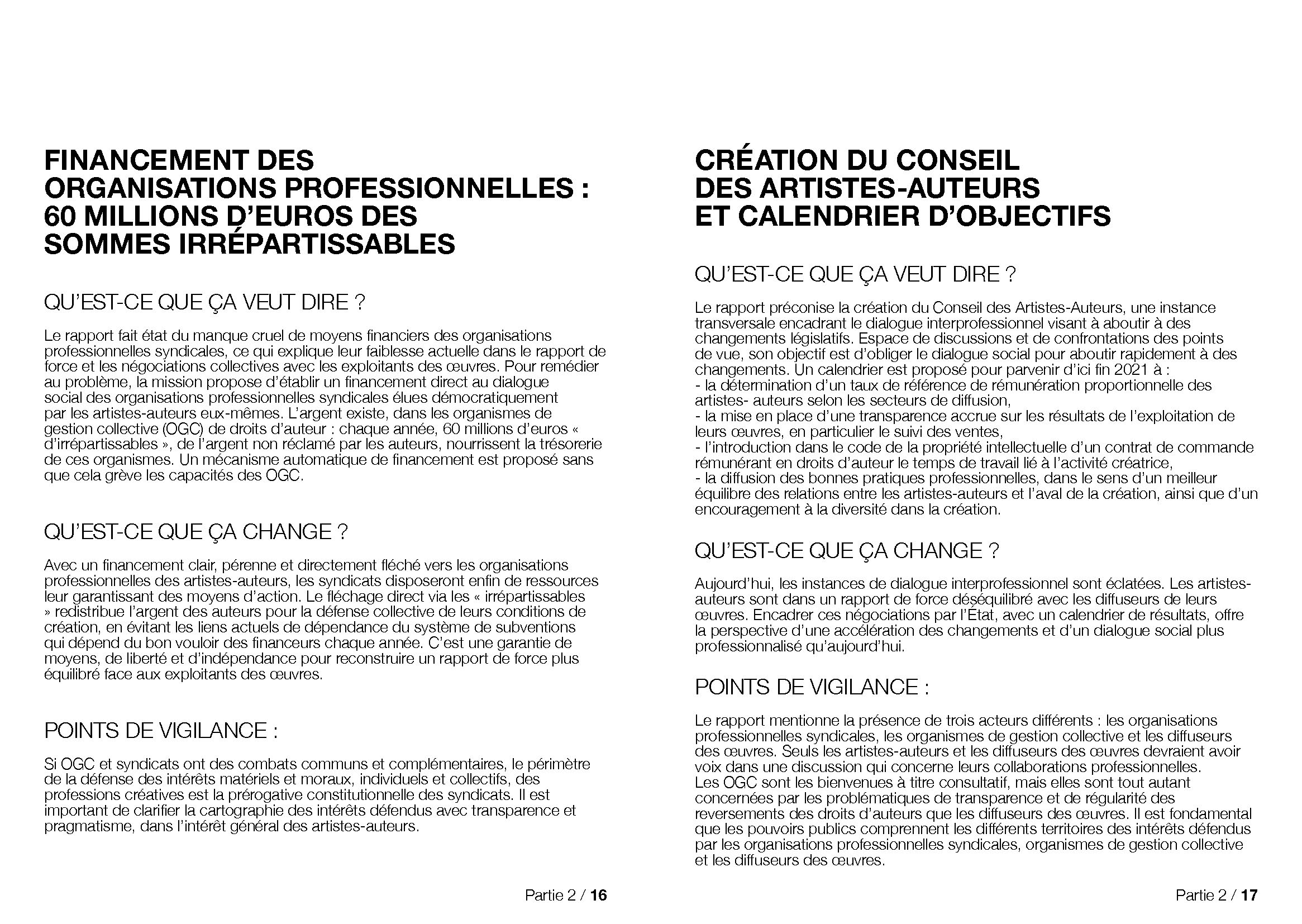 Dix organisations professionnelles de tous les métiers créatifs (écrivains et écrivaines, dessinateurs et dessinatrices, scénaristes, plasticiens et plasticiennes, photographes, peintres…) se sont réunies pour proposer une synthèse du rapport Racine. Ce document a pour vocation de décrypter les grands enjeux du rapport et d’affirmer quelles sont pour nous les mesures prioritaires. Qu’est-ce que telle mesure veut dire ? Qu’est-ce qu’elle peut changer ? Quels sont les points de vigilance ?