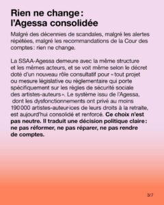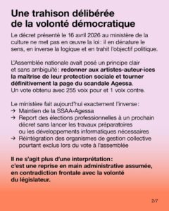 Malgré des décennies de scandales, malgré les alertes répétées, malgré les recommandations de la Cour des comptes : rien ne change. La SSAA-Agessa demeure avec la même structure et les mêmes acteurs, et se voit même selon le décret doté d’un nouveau rôle consultatif pour « tout projet ou mesure législative ou réglementaire qui porte spécifiquement sur les règles de sécurité sociale des artistes-auteurs ». Le système issu de l’Agessa, dont les dysfonctionnements ont privé au moins 190 000 artistes-auteur·ices de leurs droits à la retraite, est aujourd’hui consolidé et renforcé. Ce choix n’est pas neutre. Il traduit une décision politique claire : ne pas réformer, ne pas réparer, ne pas rendre de comptes.