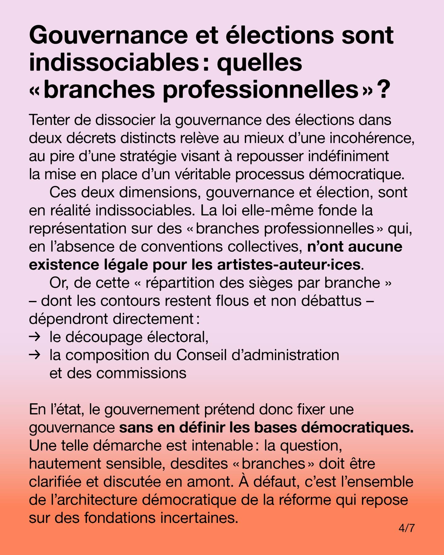 Tenter de dissocier la gouvernance des élections dans deux décrets distincts relève au mieux d’une incohérence, au pire d’une stratégie visant à repousser indéfiniment la mise en place d’un véritable processus démocratique. Ces deux dimensions, gouvernance et élection, sont en réalité indissociables. La loi elle-même fonde la représentation sur des « branches professionnelles » qui, en l’absence de conventions collectives, n’ont aucune existence légale pour les artistes-auteur·ices.