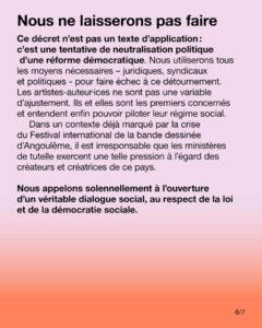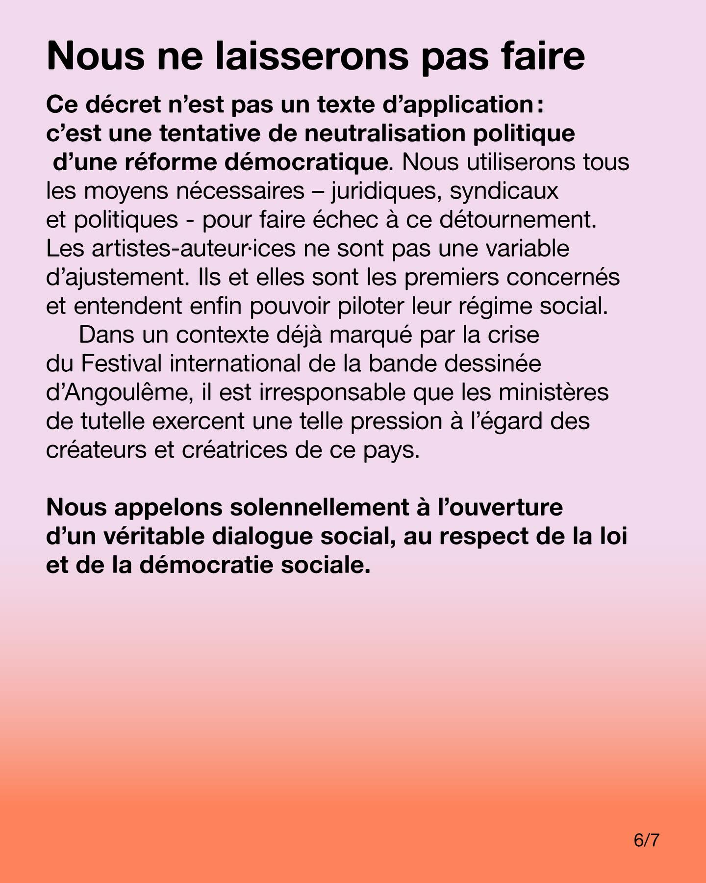 Ce décret n’est pas un texte d’application : c’est une tentative de neutralisation politique d’une réforme démocratique. Nous utiliserons tous les moyens nécessaires – juridiques, syndicaux et politiques – pour faire échec à ce détournement. Les artistes-auteur·ices ne sont pas une variable d’ajustement. Ils et elles sont les premiers concernés et entendent enfin pouvoir piloter leur régime social. Dans un contexte déjà marqué par la crise du Festival international de la bande dessinée d’Angoulême, il est irresponsable que les ministères de tutelle exercent une telle pression à l’égard des créateurs et créatrices de ce pays.